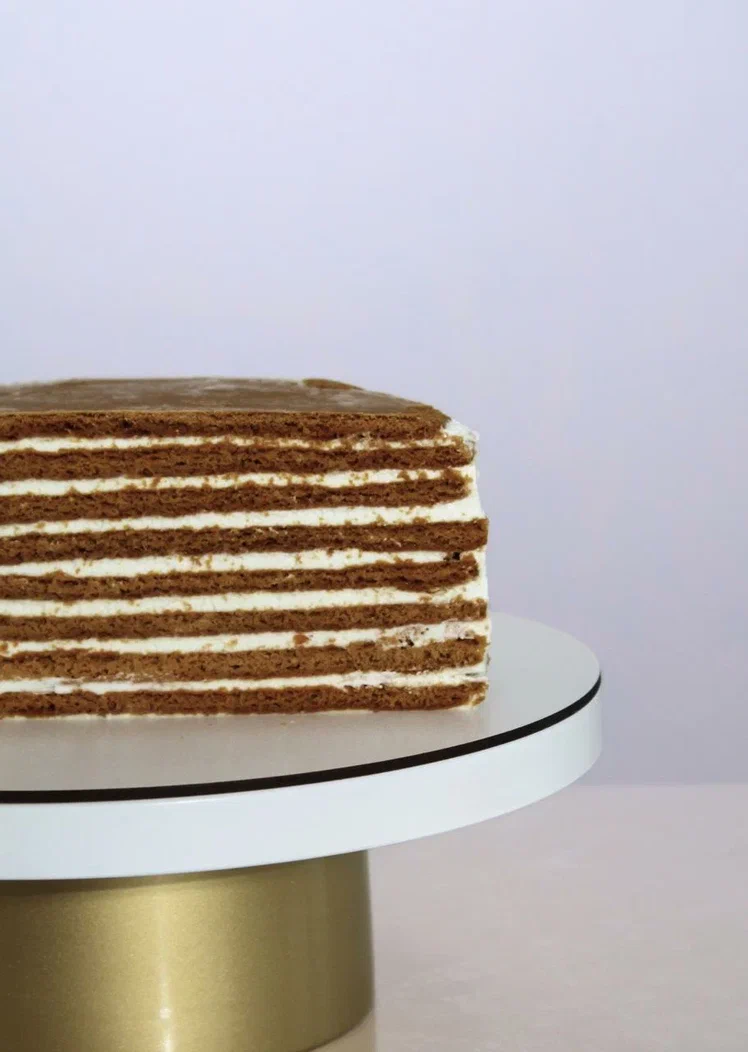 Тонкие медовые коржи, прослоенные кремом из сливочного масла и вареного сгущенного молока