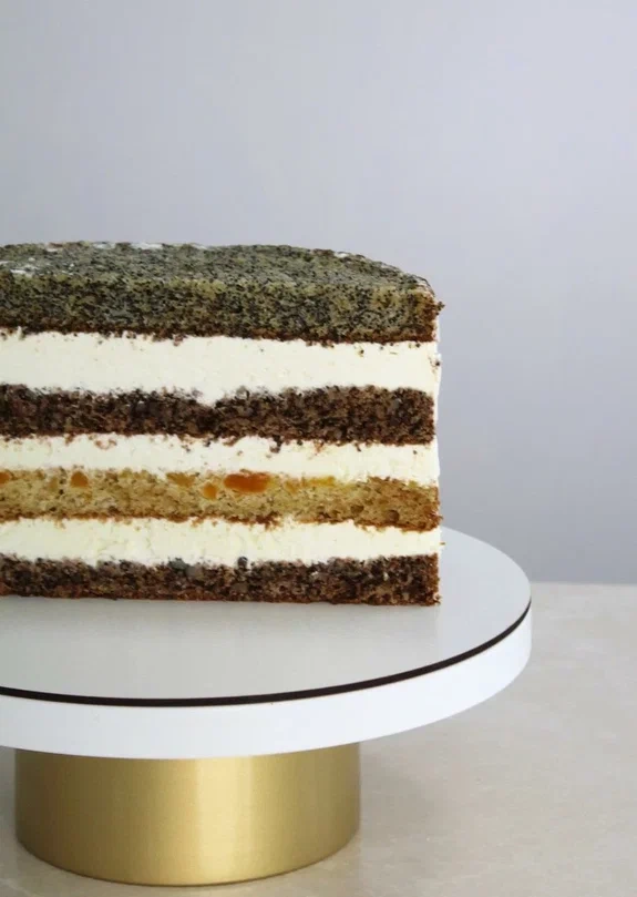 Бисквитные коржи с маком, курагой и грецким орехом, в сочетании с кремом из взбитых натуральных сливок со сгущенным молоком