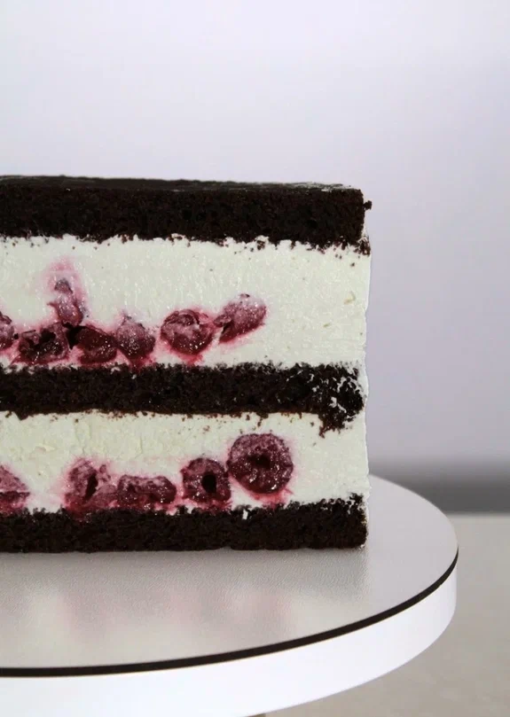 Шоколадный бисквит, прослоенный сметанным кремом и свежей спелой вишней