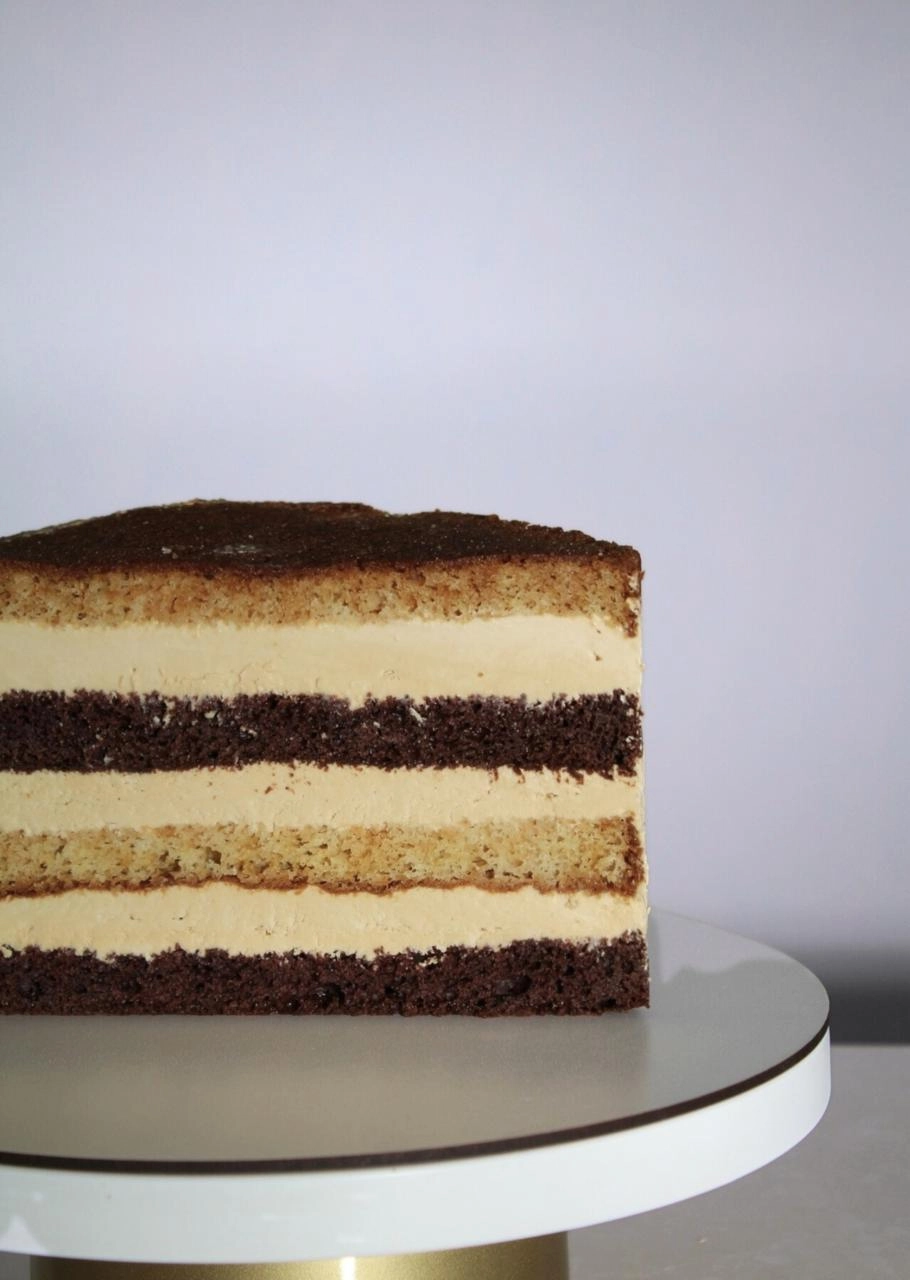 Шоколадный и молочный бисквит в сочетании с кремом из взбитых натуральных сливок с вареным сгущенным молоком