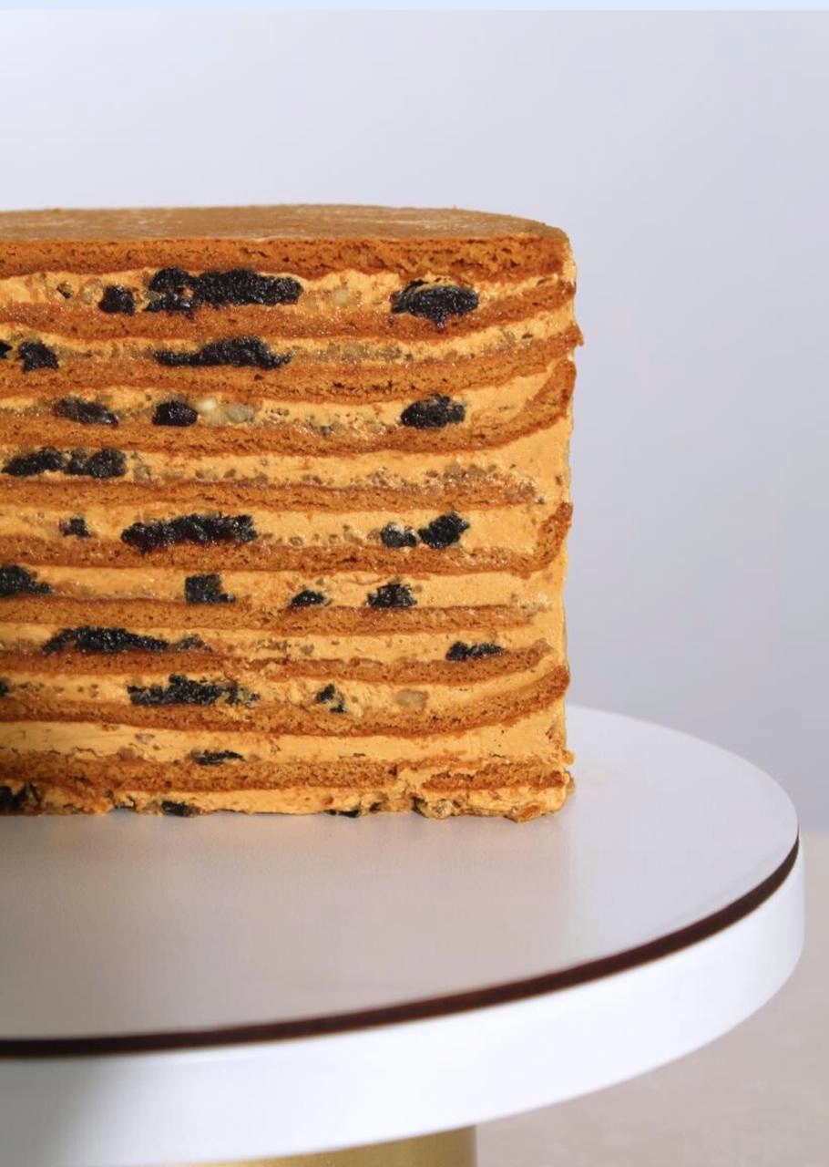 Тонкие медовые коржи, прослоенные кремом из сливочного масла и вареного сгущенного молока, с черносливом и грецким орехом